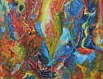 2014Gezien de volheid en wirwar van afbeeldingen typerend voor mijn begin met schilderen. Opvallend vind ik het 3hoekig smalle middendeel, lijkt op iets wat 2spalt wil zaaien. Geen idee wat dit verder betekent. Ik heb wel veel geleerd van hoe het gaat als je schildert, wat er gebeurt met het schilderij en met jezelf.