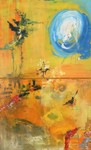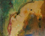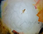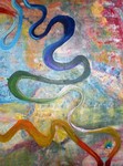 2015De aardgeest links boven op schilderij, volgens mijn penseel dan, gezien tijdens verblijf in Lothlorien in de Haut Marne in noordoost Frankrijk.Tijdens een cursus daar "Leer je eigen natuur kennen" is de aanzet voor dit schilderij langzaam gegroeid en gerijpt in beelden en vormendie al schilderend, krassend, vegend, spetterend e.d. mooi tevoorschijn kwamen later. Aanleiding was het gebeuren van vallen en opstaan, zoeken van mijn zoon tijdens de puberteit, en zaken die hier in meespeelden, zoals de natuur, lucht, aarde en water. Pas later ben ik hier achtergekomen, o.a. na afronden van de genoemde cursus. Zelf vind ik dit een van de mooiste die ik gemaakt heb tot nu toe, ook door de specifieke omstandigheden waaronder het gebeurde.